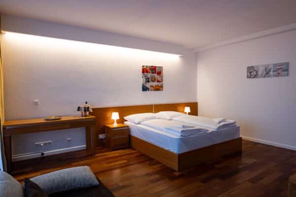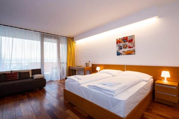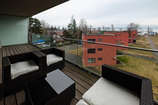 37 m2-es apartmanunk lenyűgöző tóra nyíló kilátással és privát erkéllyel rendelkezik. Az apartmanban a legmagasabb minőségű Rottex matraccal ellátott franciaágy és ággyá alakítható kanapé található.